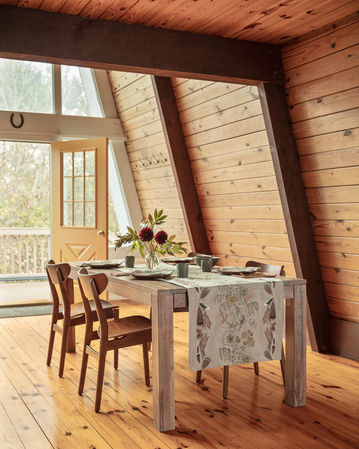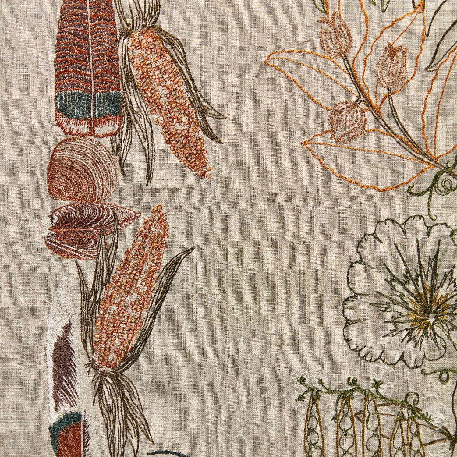 - For this embroidered design we researched the agricultural staples of Indigenous peoples in early America. Corn stalks, squash, nuts, mussels, and legumes are stitched across the table runner, with a border featuring embroidered feathers of passenger pigeons, wild turkeys, mallards and wood ducks.