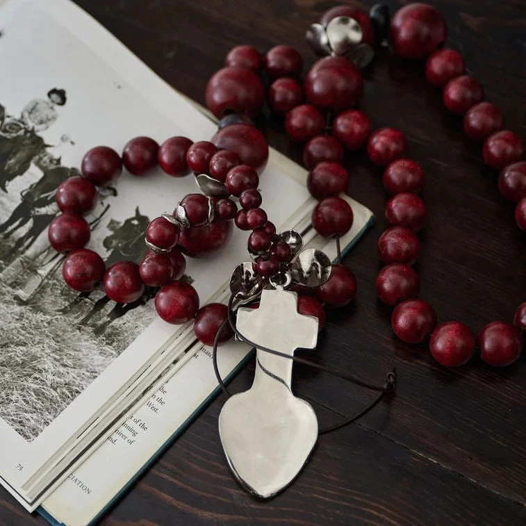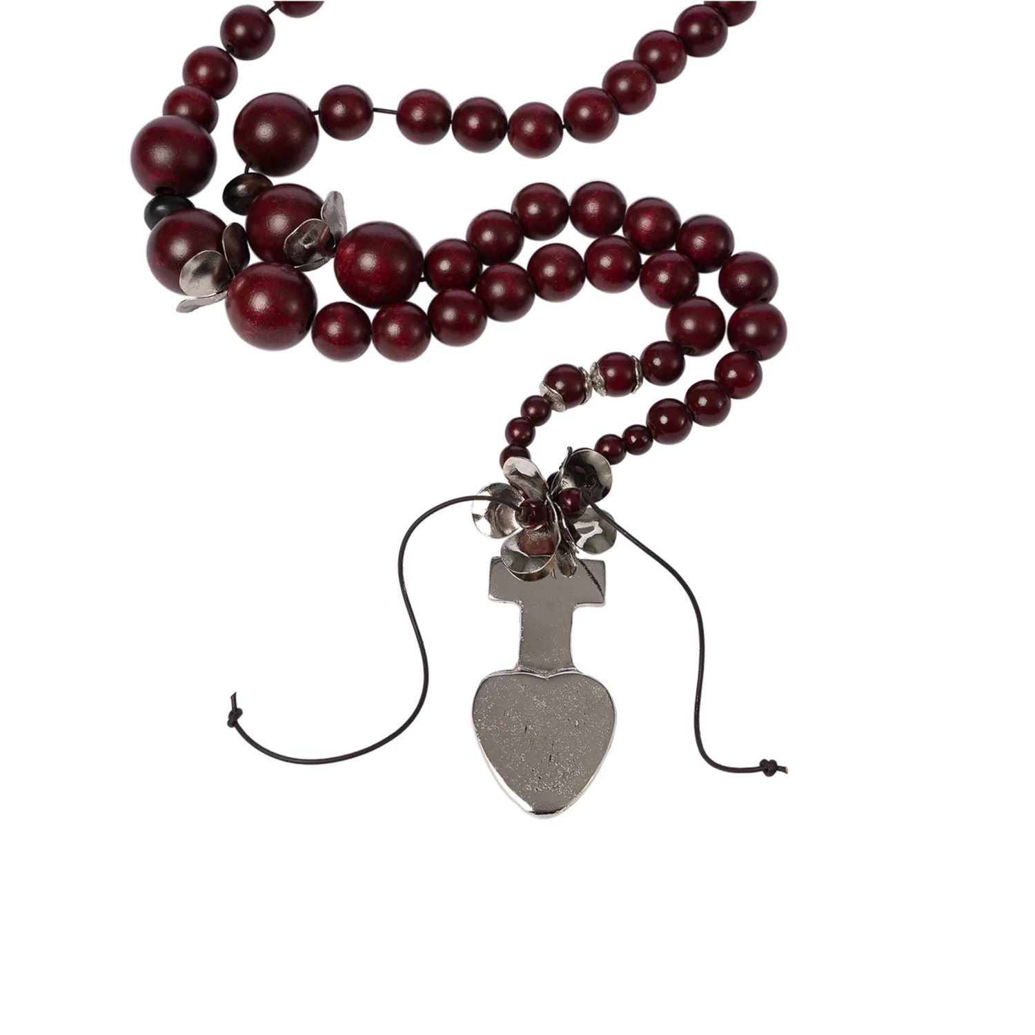 - Red wooden blessing beads with nickel Bendita Vida cross and heart and leather tie