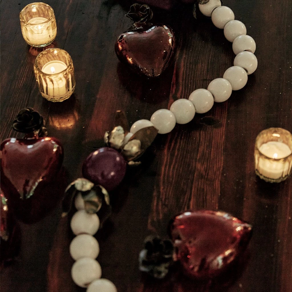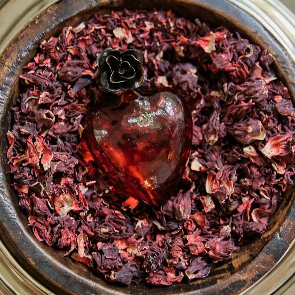 - Mouth blown red glass heart.