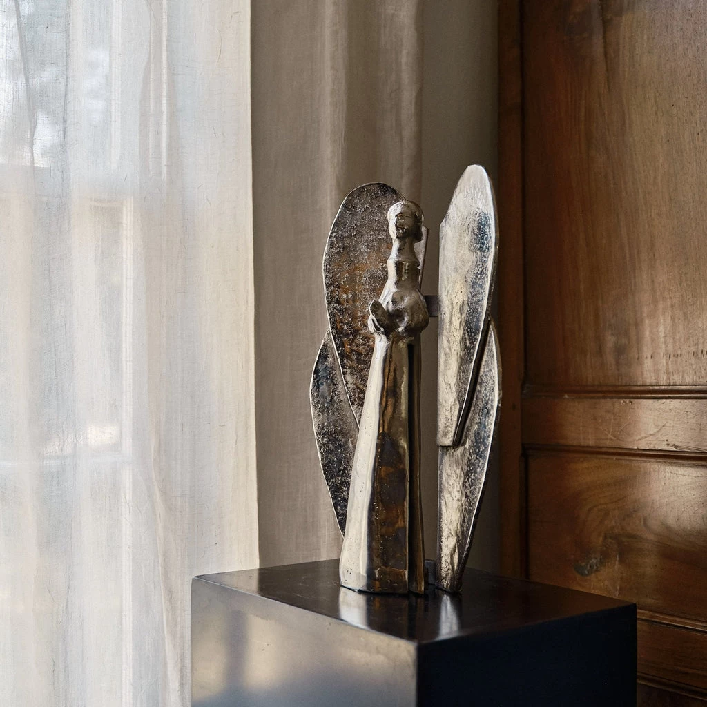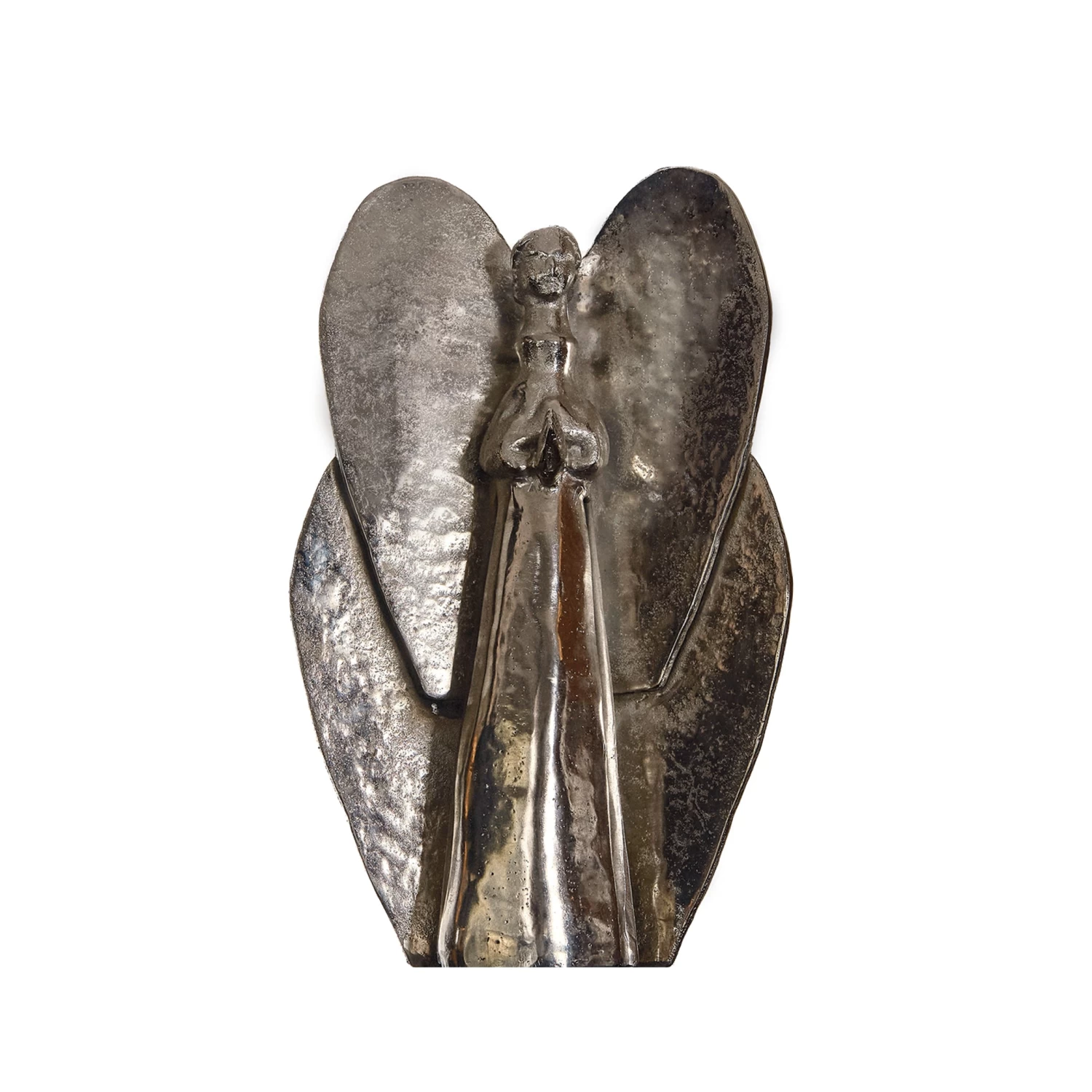 - Wax cast iron sculpture plated in German nickel soars to embrace and shelter those in her presence with grace and dignity