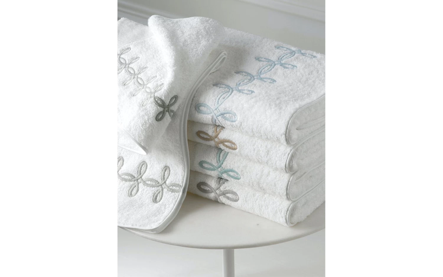 - Cairo terry towels with white embroidered graceful knots in classic colors.
