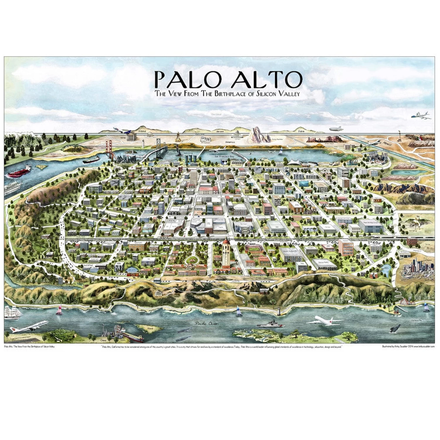 Kirby Scudder’s imaginative map of Palo Alto, California. The map is in the New Yorker style, where main part is shown accurately but then jumps to far away locations. The map is focused on the Silicon Valley businesses (circa 2014 or so).