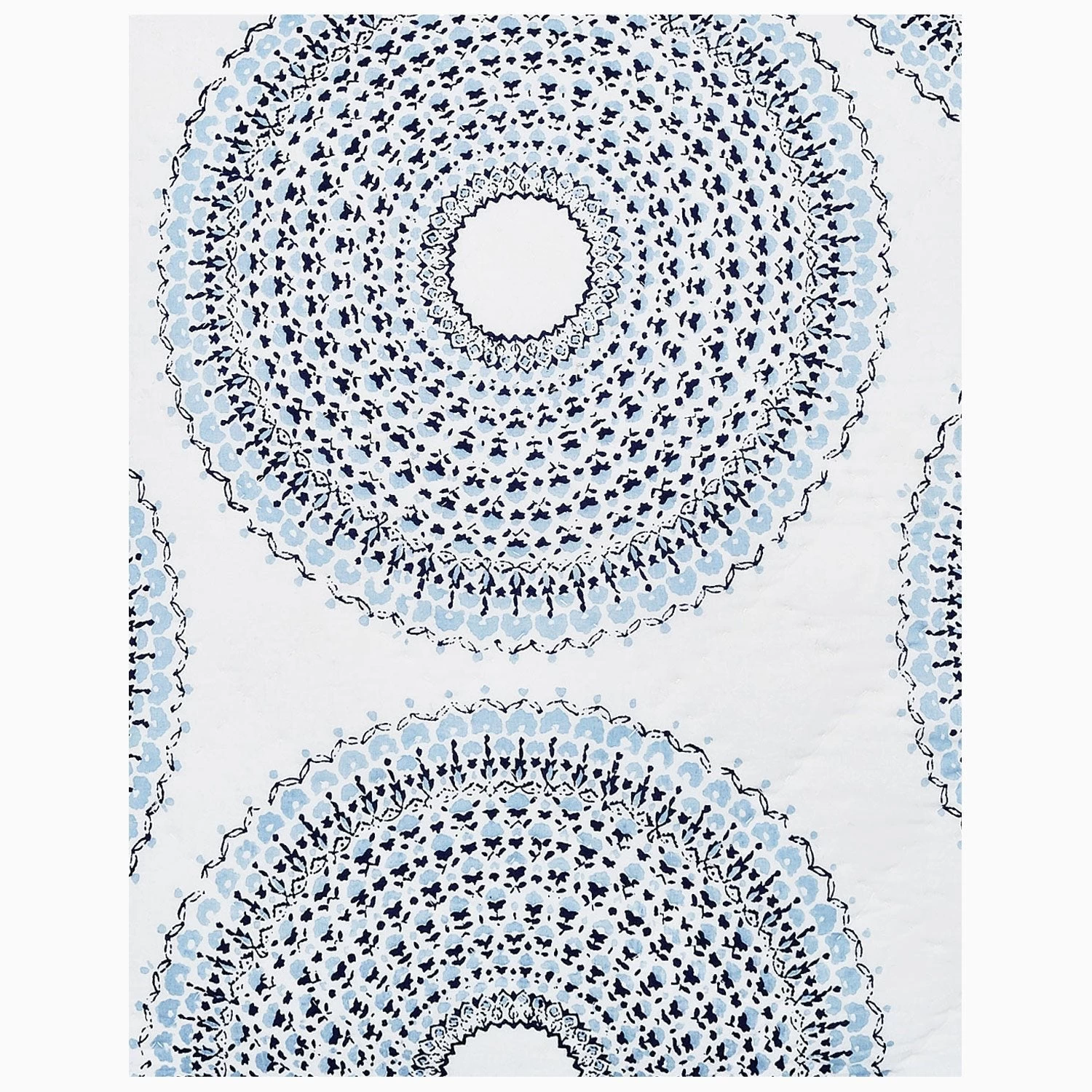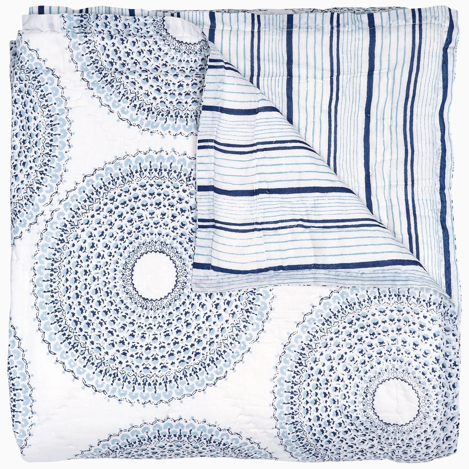 - Large scale woodblock print pattern reverses to striped pattern in light and dark indigo hues on soft, lightweight cotton voile fabric filled with all natural cotton batting
