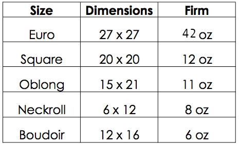 Sizes: Euro 27×27, Square 20×20, Oblong 15×21, Neckroll 6 x 12, Boudoir 12 x 16