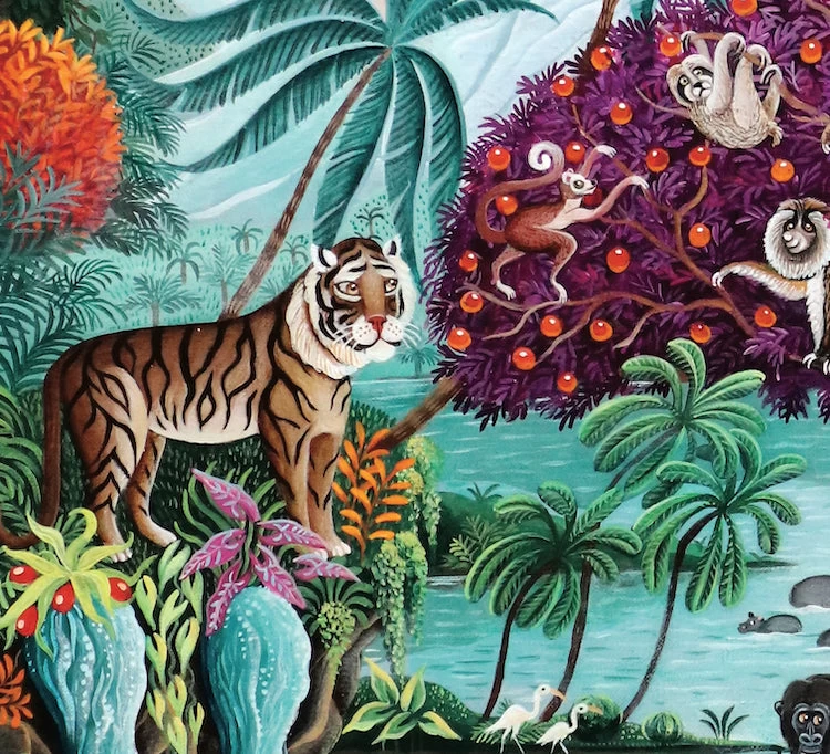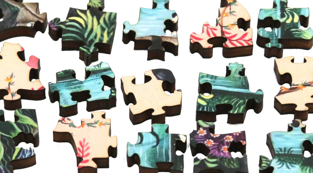 - Colorful and lively jungle scene with straight edges, square-ish connector pieces, and robust animal whimsical pieces that are sometimes whole animals, and sometimes multi-pieced