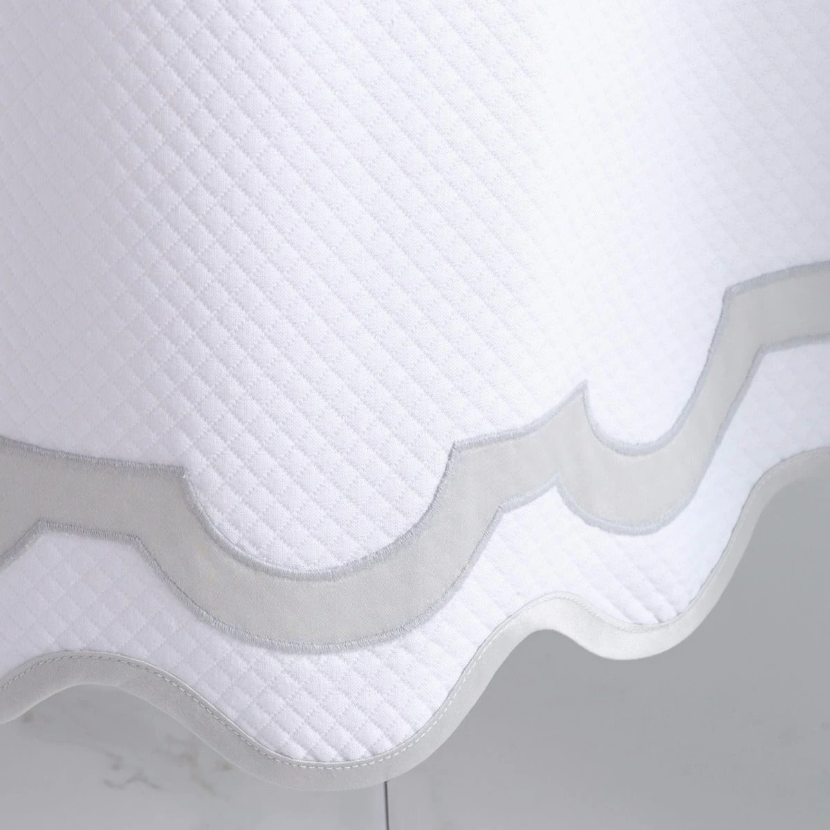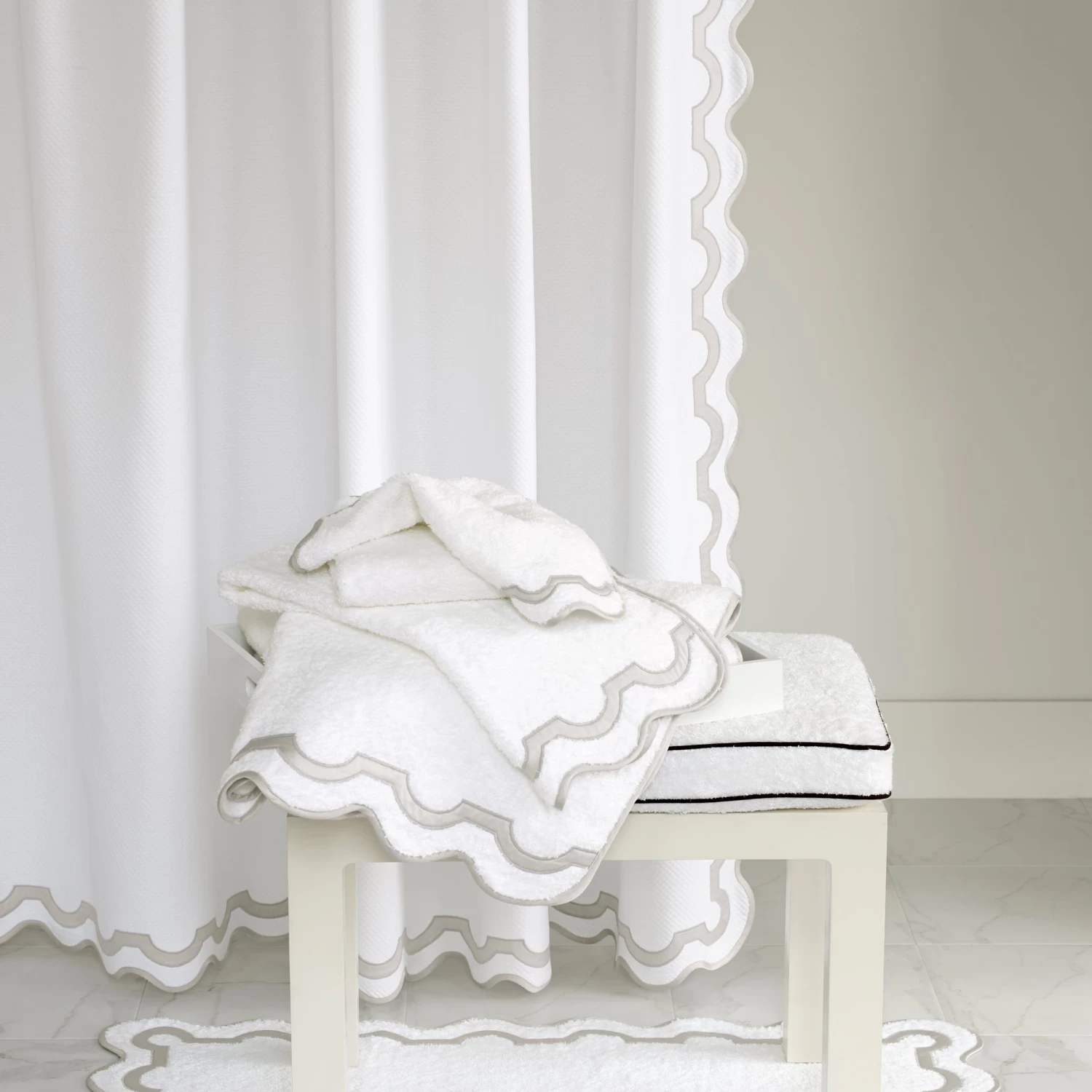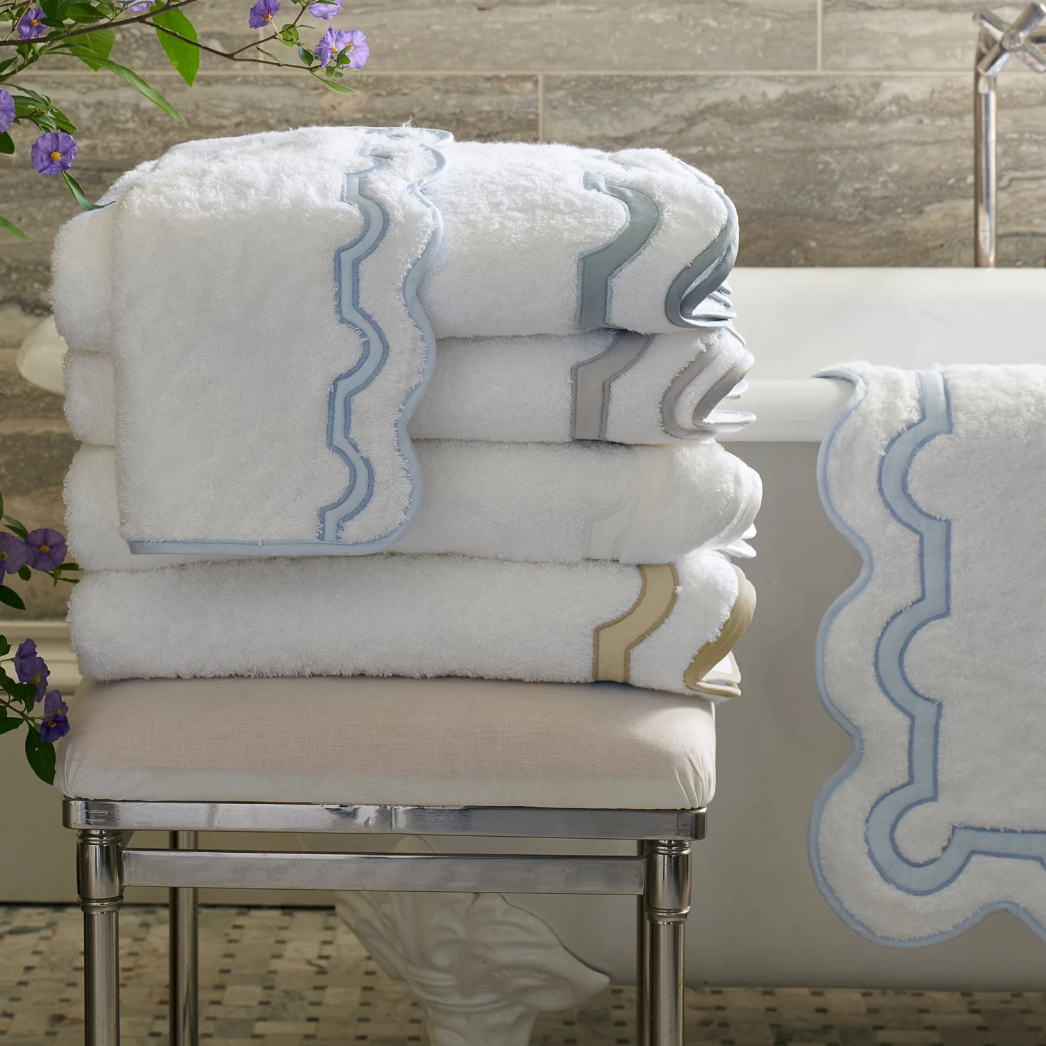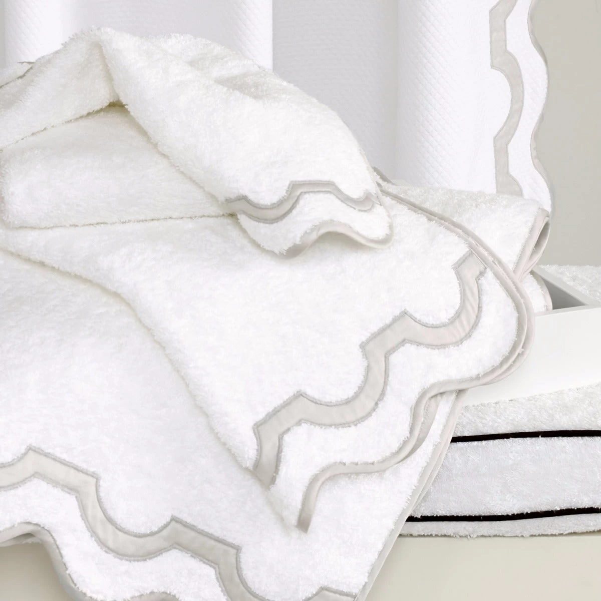 - Nocturne scallop sateen appliqué on white Cairo long-staple cotton terry.