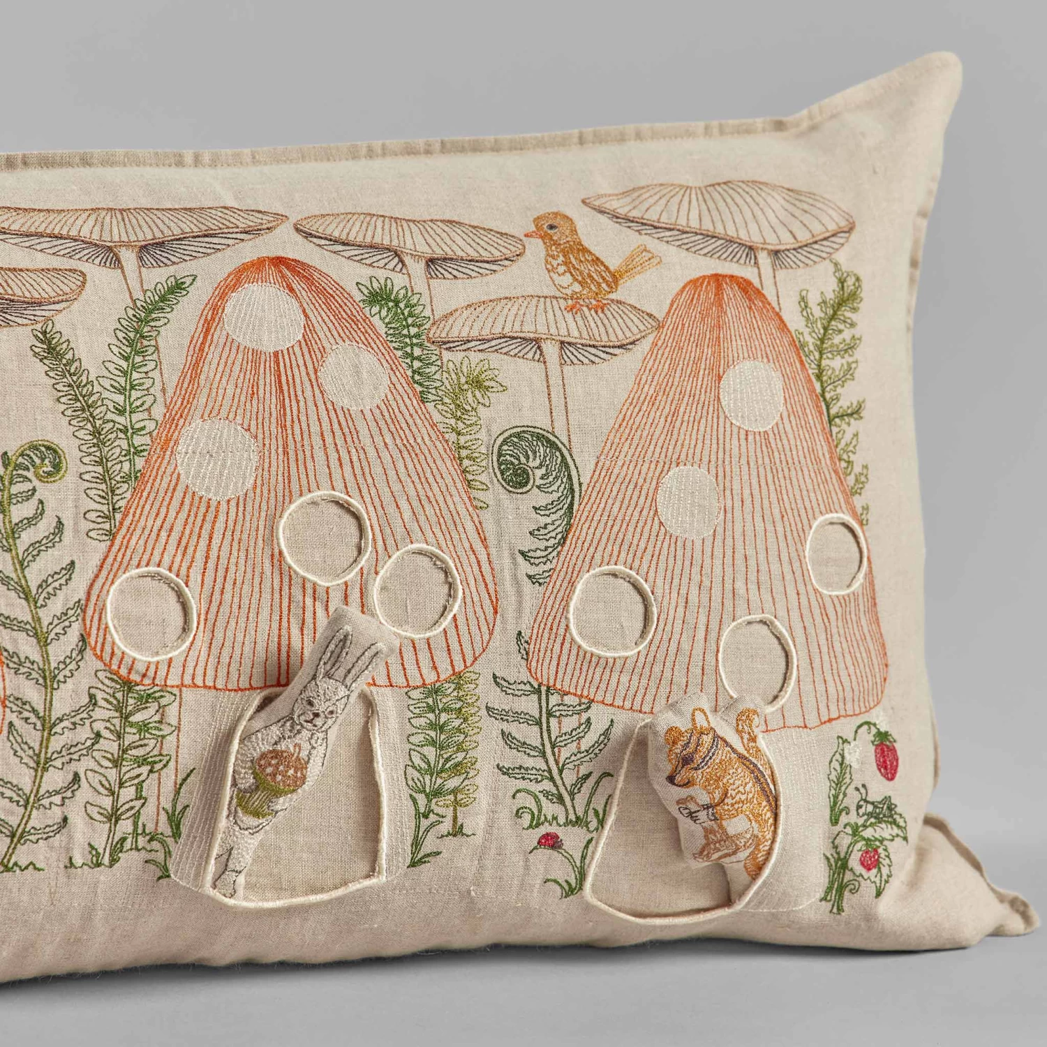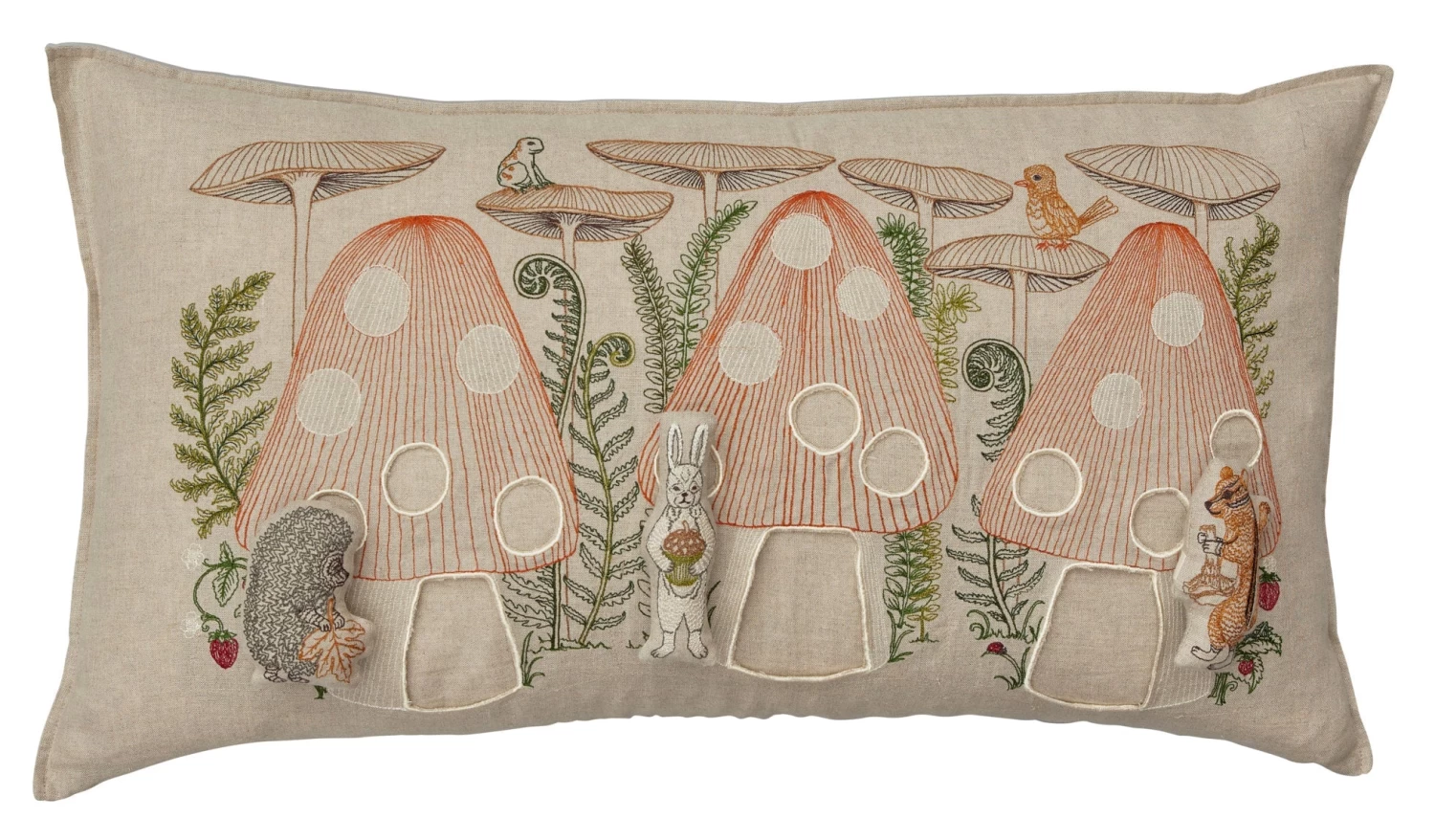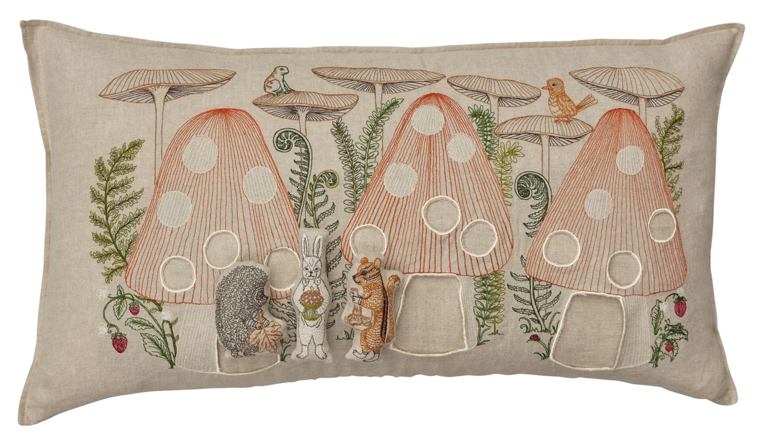 - In each mushroom house resides a cute critter. Find hedgehog holding a fallen leaf, bunny with an acorn, and chipmunk with a chanterelle. Other animals in this design include a gold bird, grasshoppers and a boreal chorus frog.