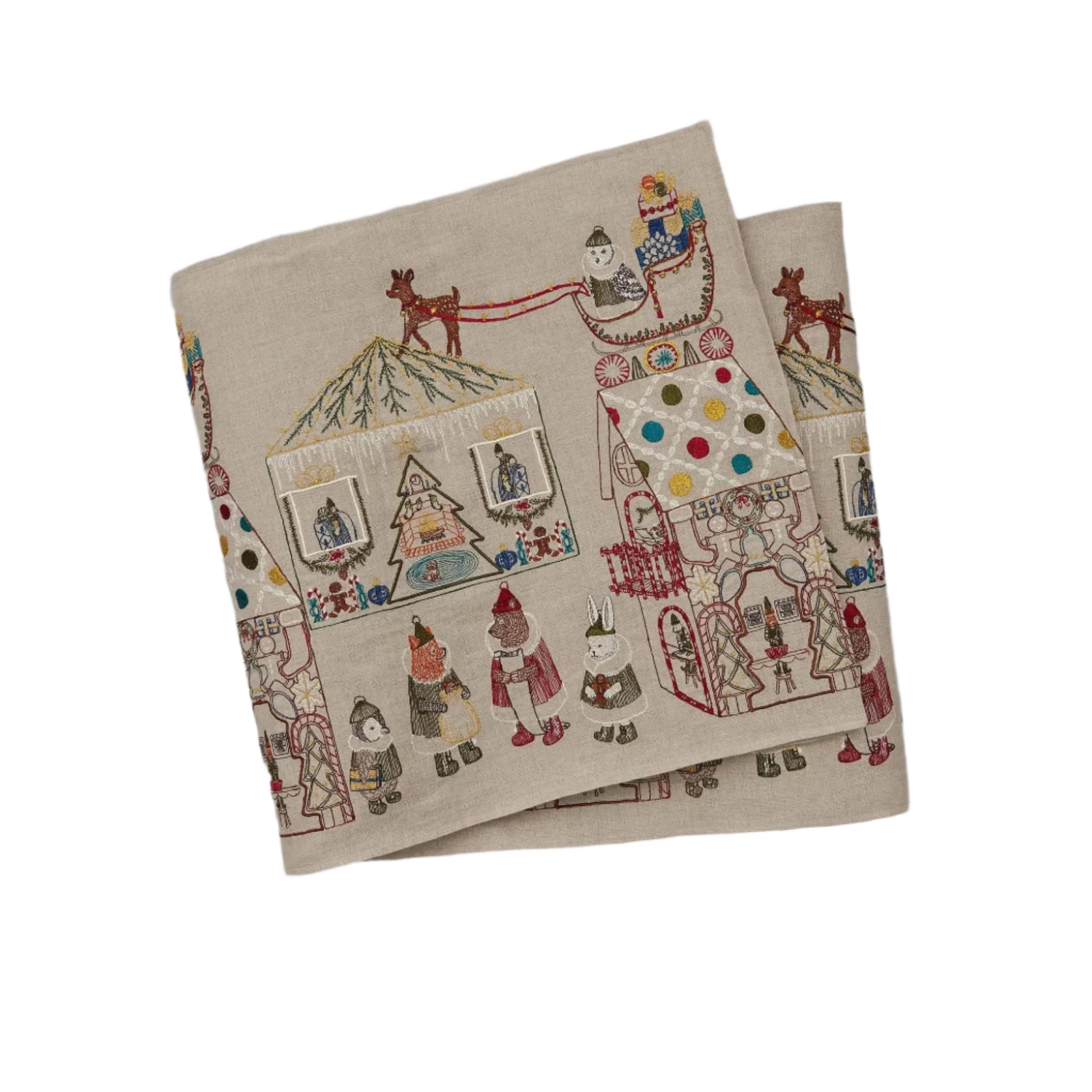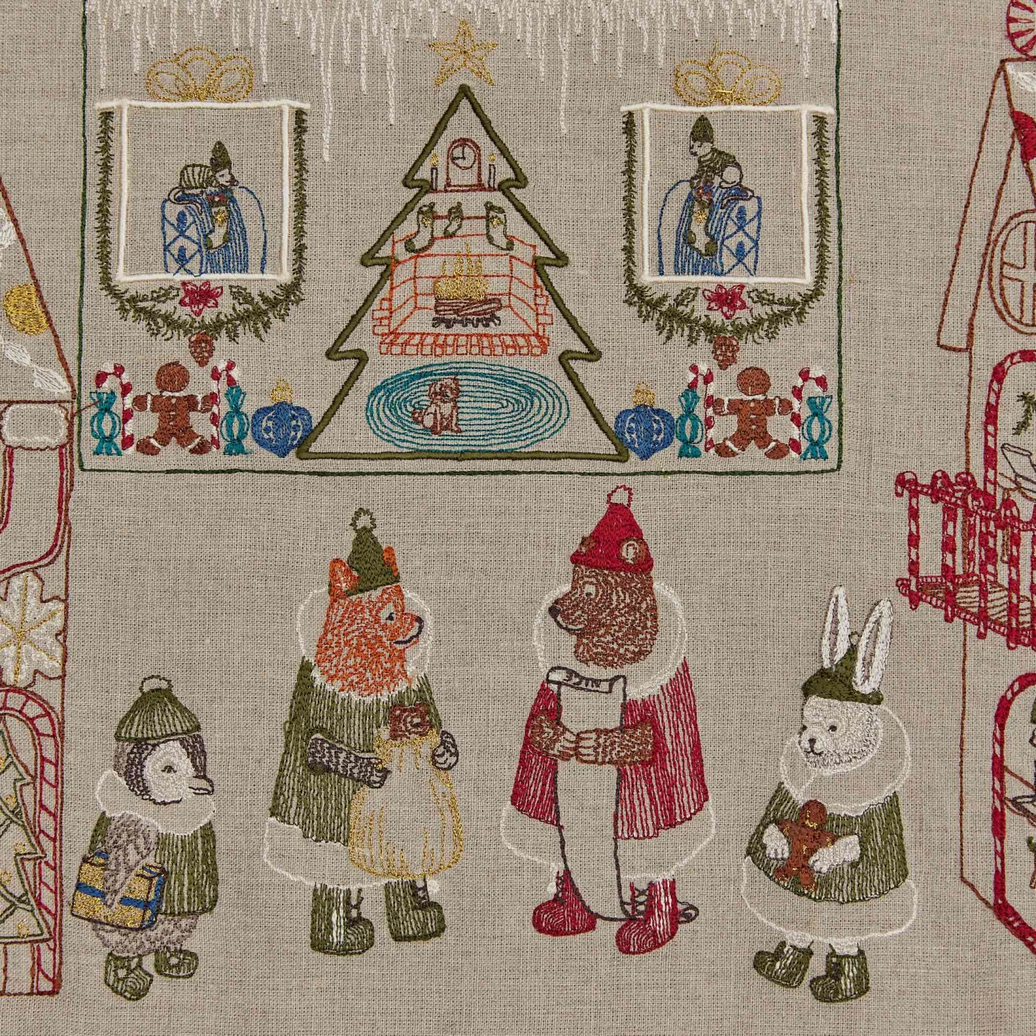 Explore the thoughtful interiors of Santa’s house, spot bear and fox elves baking cookies, and count out every sparkling gift and cute cookie on the front, solid back. - 100% linen backing.