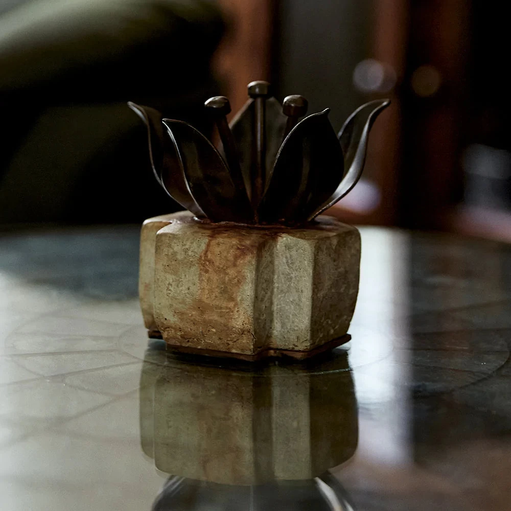 - Wax cast stone cross with iron base topped with an iron flower in bloom