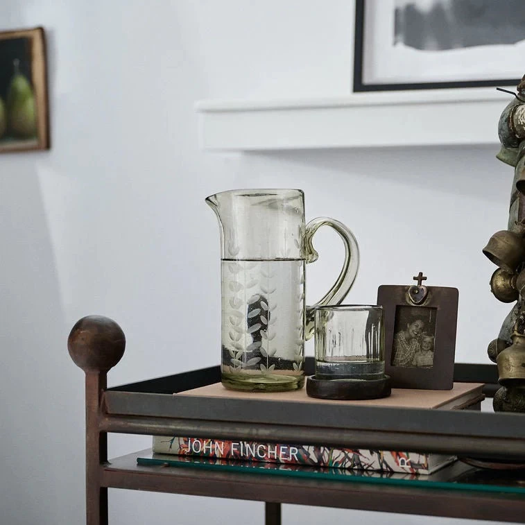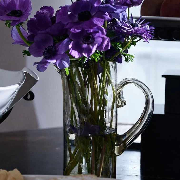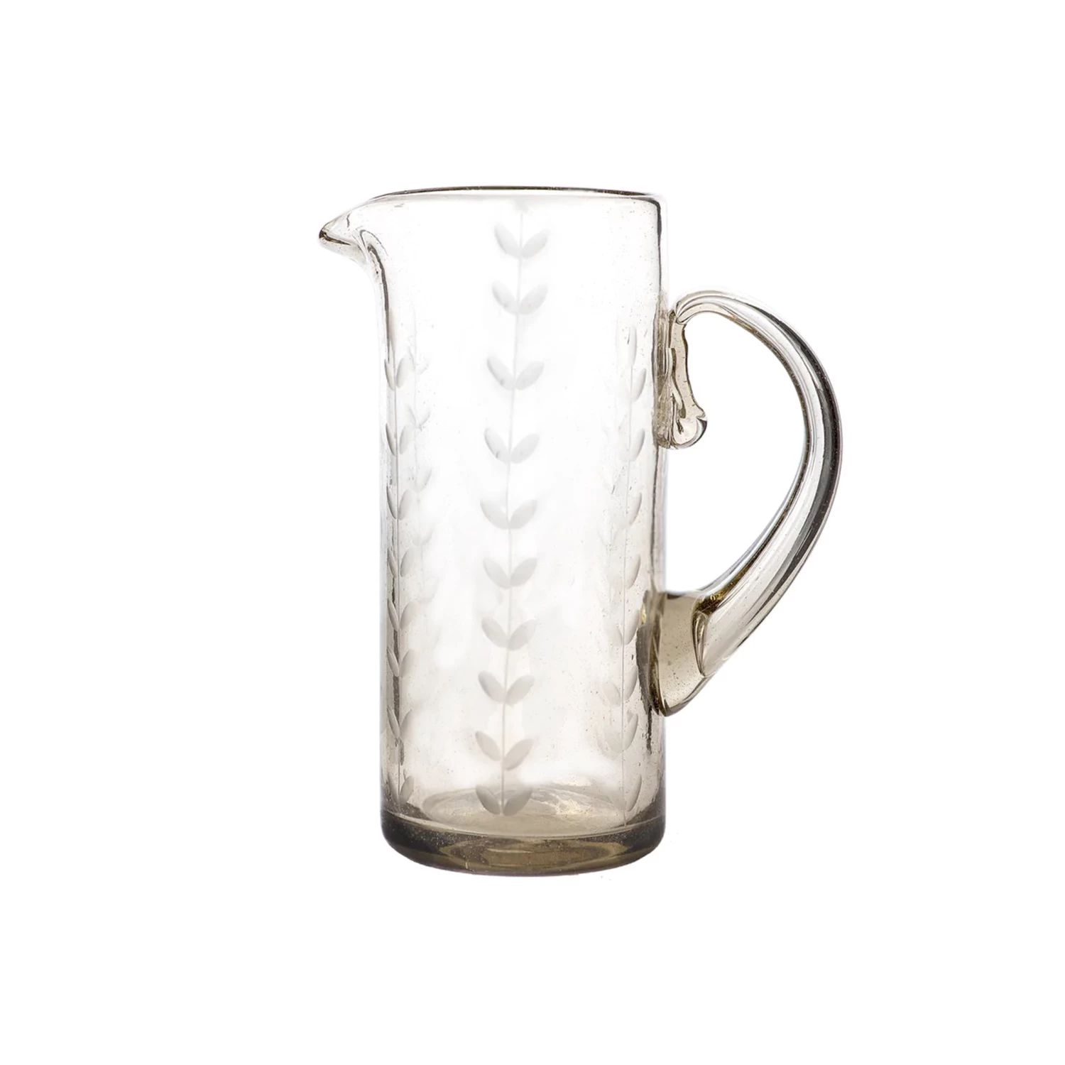- Mouth-blown clear glass tubo pitcher with climbing laurel etching signifies longevity & prosperity