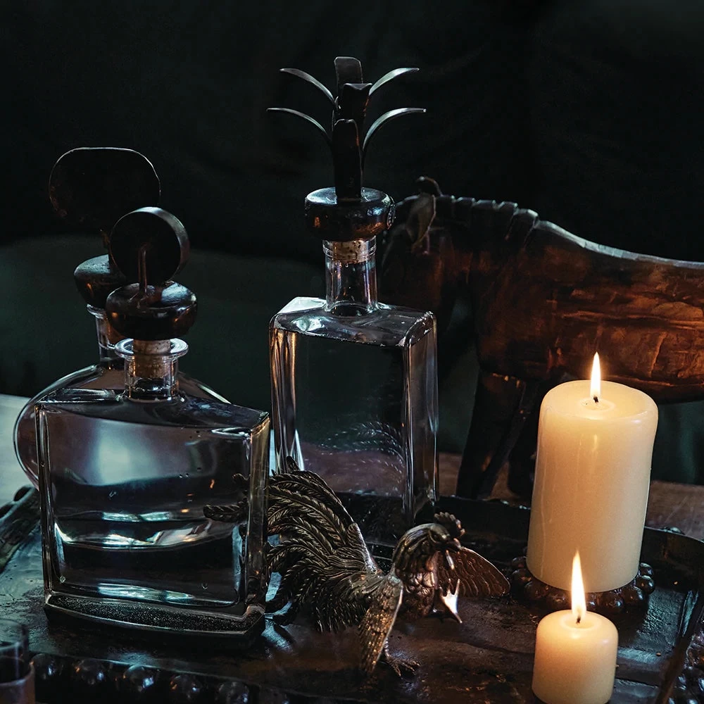 - Cast iron agave stopper atop a crystal clear decanter resting in a cast iron coaster