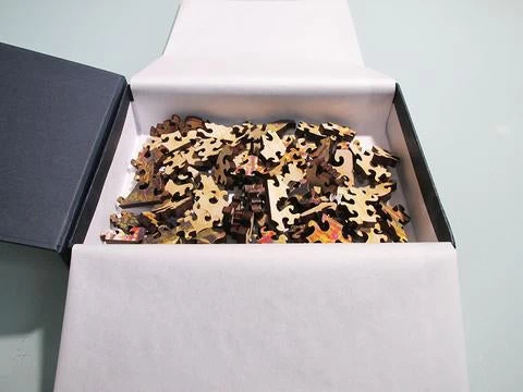 - Wooden jigsaw puzzle pieces packaged in a small blue box with magnetic clasp.