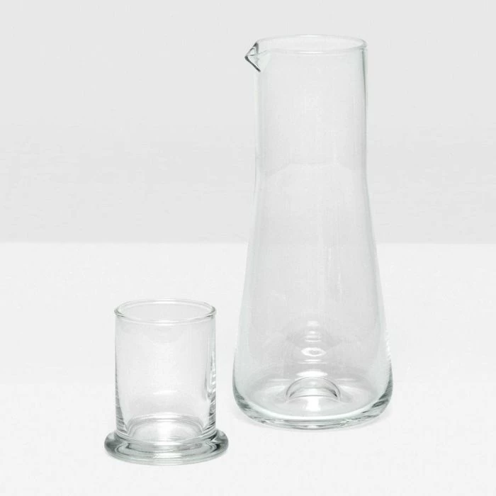 - Clear hand-blown glass beaker carafe with tumbler that fits inside top