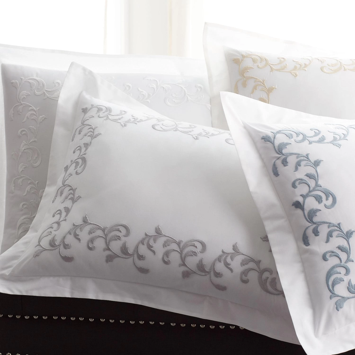 - Shams have embroidered scroll frame, scaled to size, with 2″ flanges
