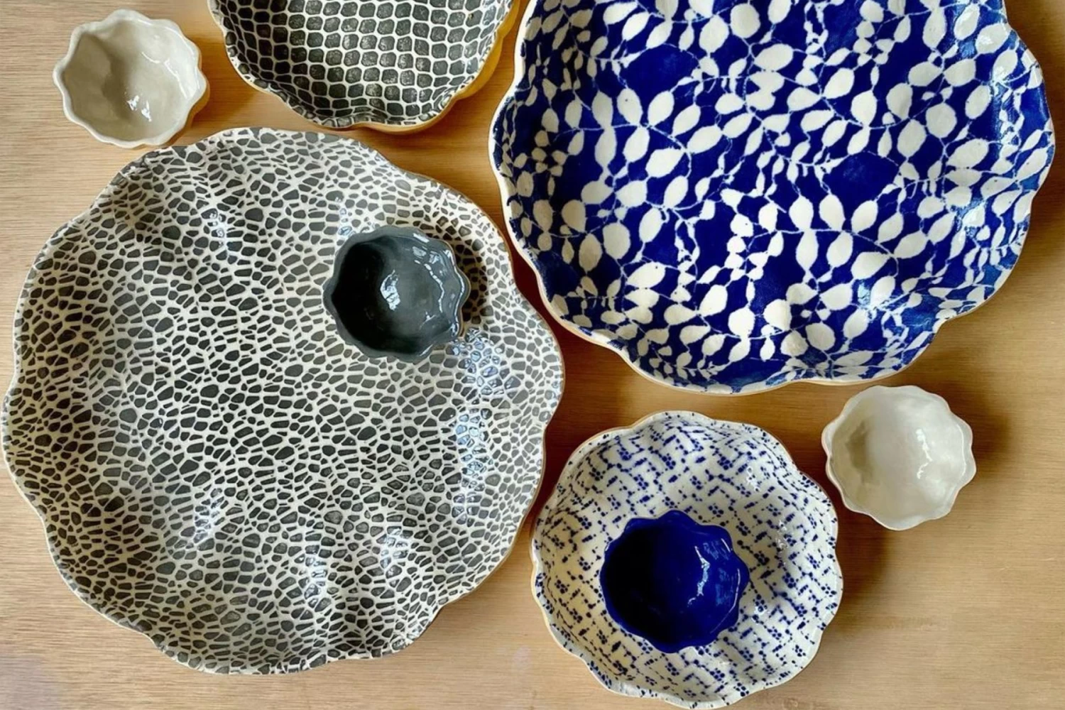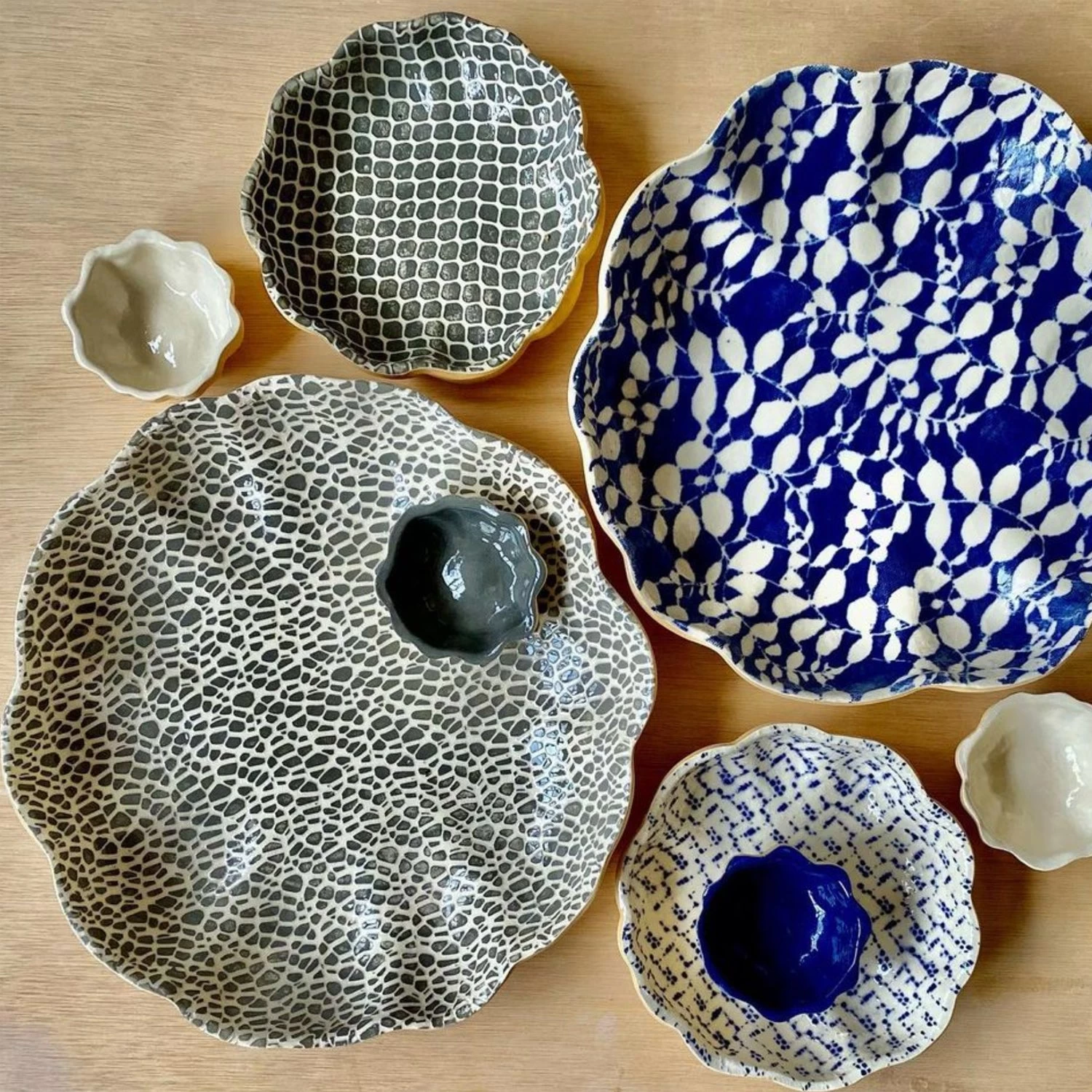 - Mini Scallop Bowl: 3.75″ diameter x 1.5″ high, solid only, no pattern.