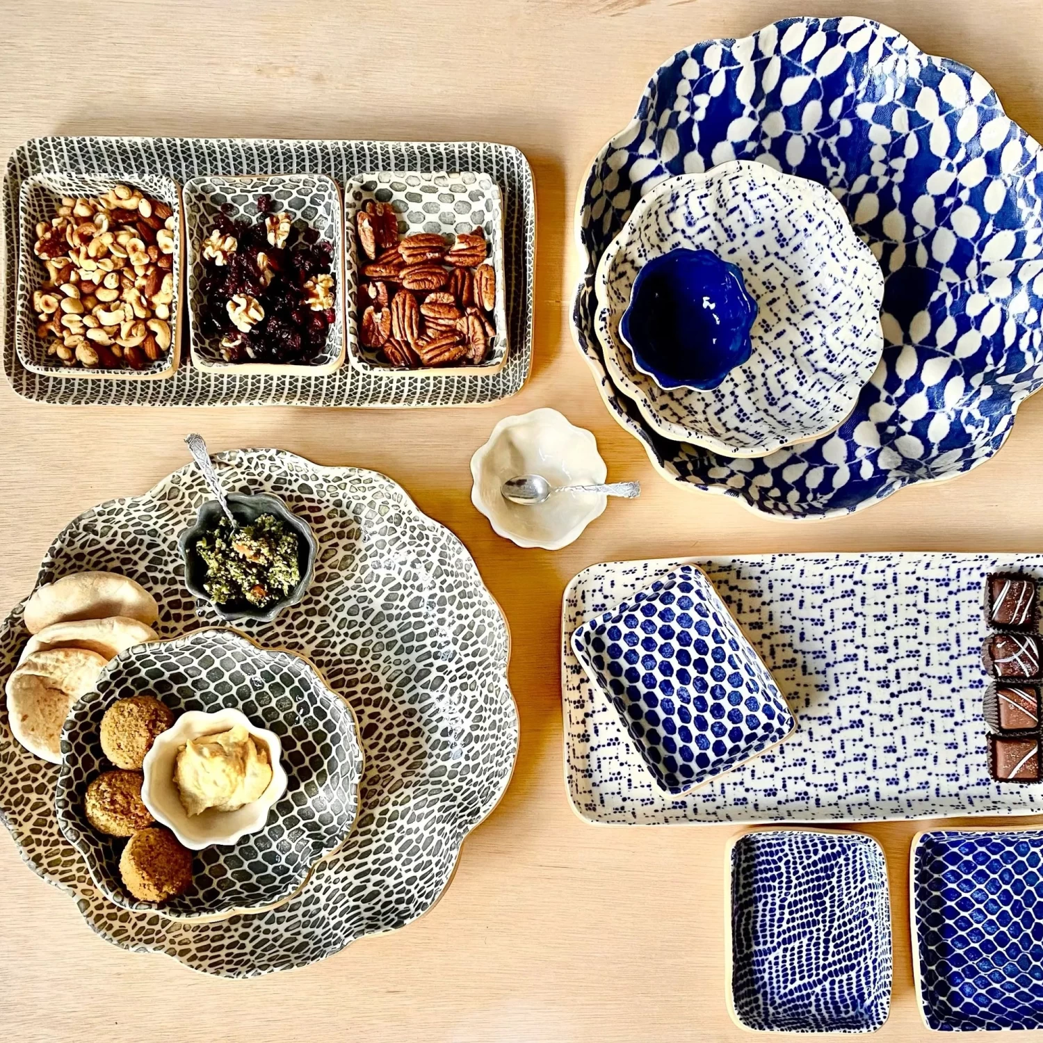 - Large Scallop Bowl: 14″ diameter x 2.5″ high, aspen and pebble pattern only.