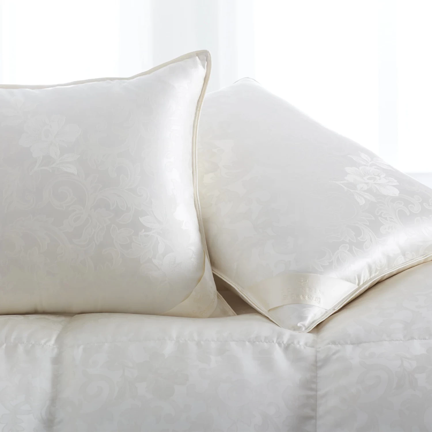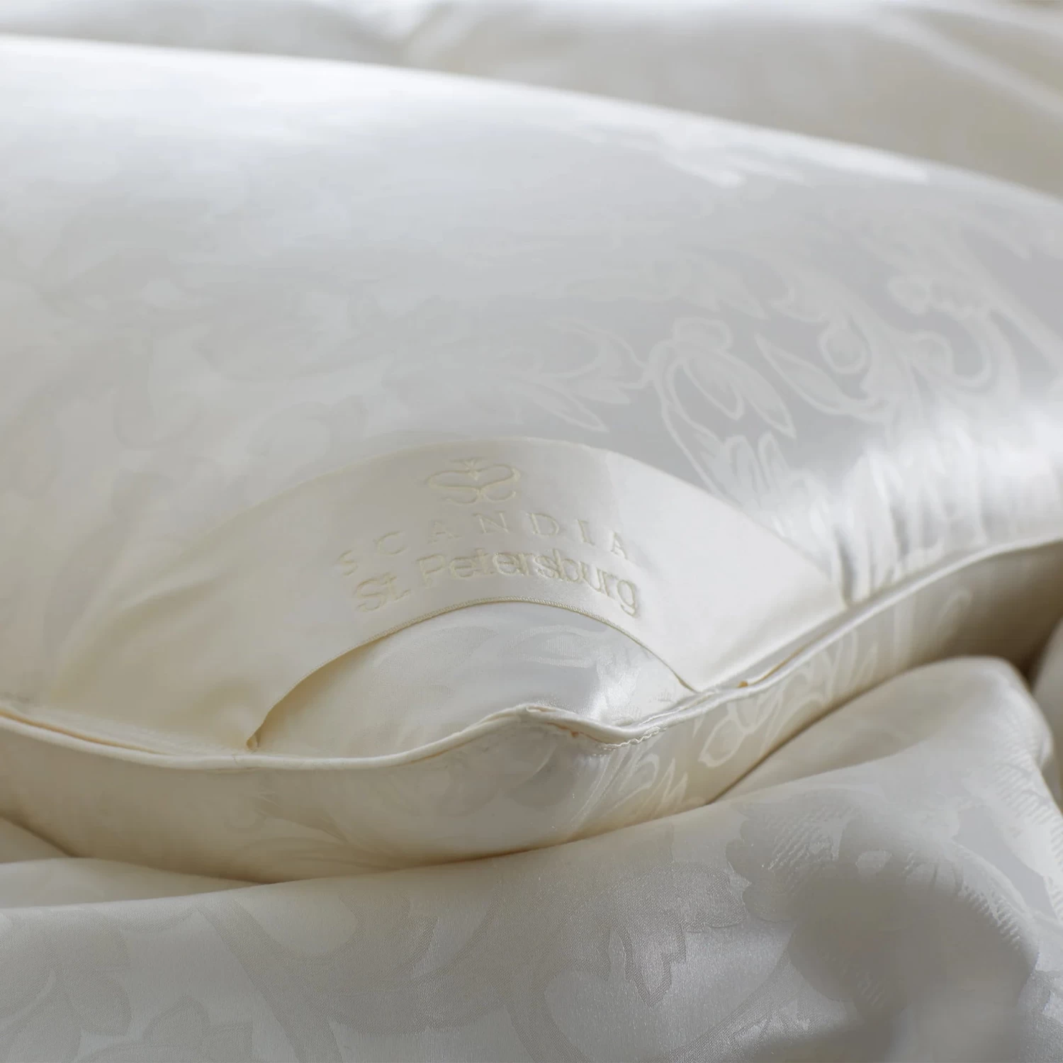 The St. Petersburg Down Pillow by Scandia Home is inspired by the richness of the city it has been named after. The creme de la creme in down pillows, the St. Petersburg is hand-crafted from the absolute finest Siberian down and covered in a superior 100% silk damask from Germany. It is exquisitely sumptuous with a fill power of 850-900 Siberian white goose down. It is the perfect ratio resulting in supreme fluff and loft, making it heirloom-quality. It comes with a certificate of authenticity and is serviced for life. St. Petersburg is for those who require the best the world has to offer in your home, on your yacht, and in your plane. The soft pillow is ideal for sleeping on your stomach, while the medium firmness is great if you sleep on your back. If you prefer to sleep on your side, the firm pillow is recommended.