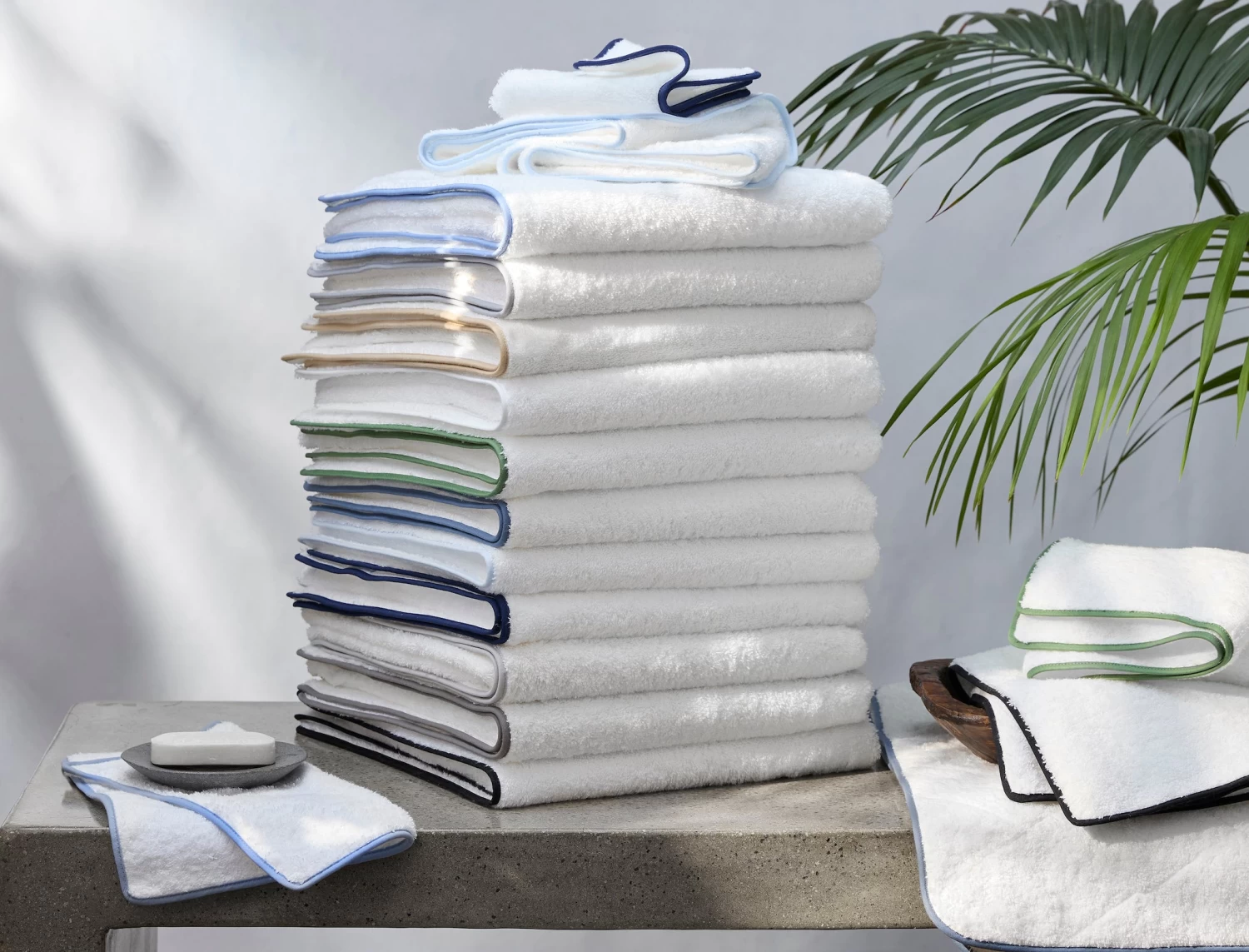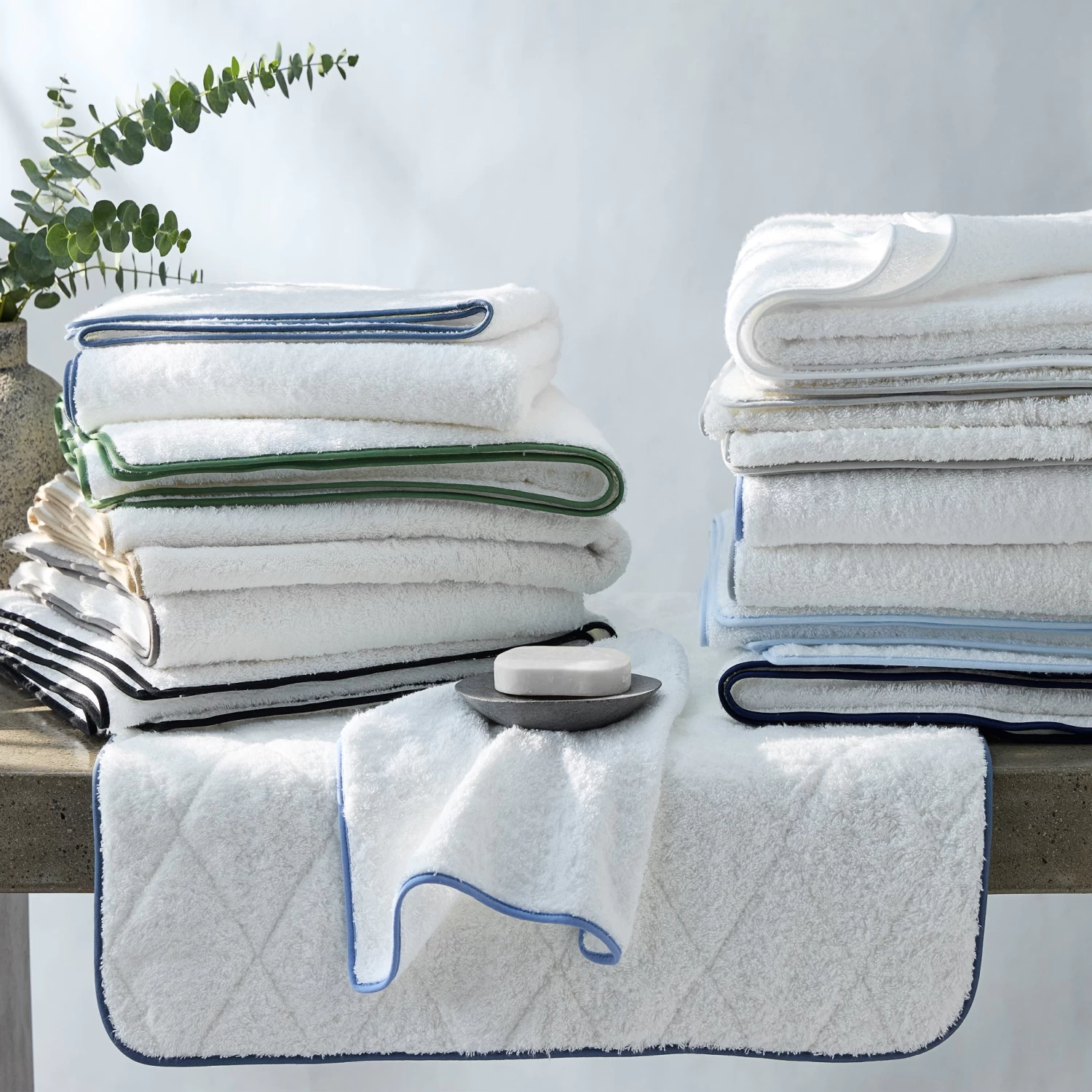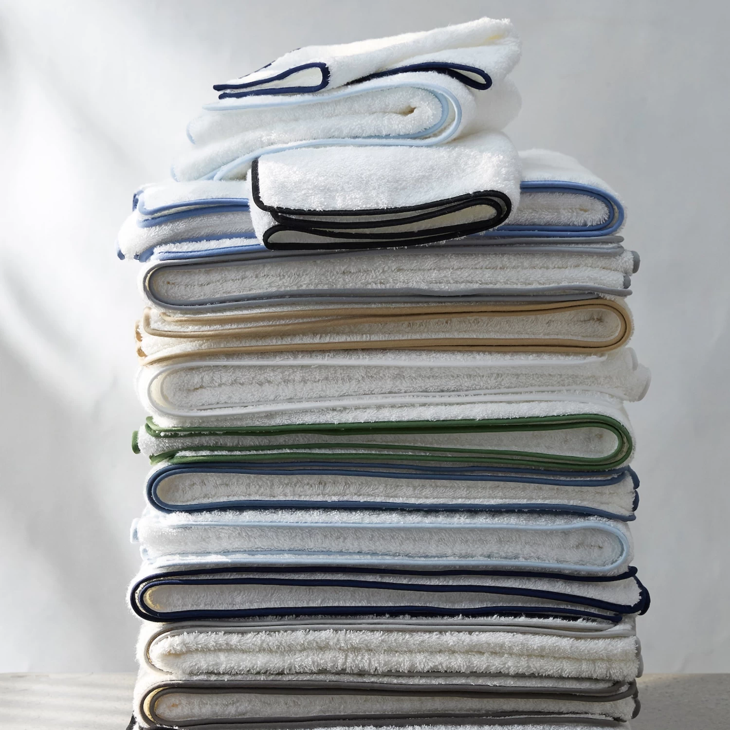 - Long-staple cotton terry bath towels and tub mats with complementing colorful straight edge piping