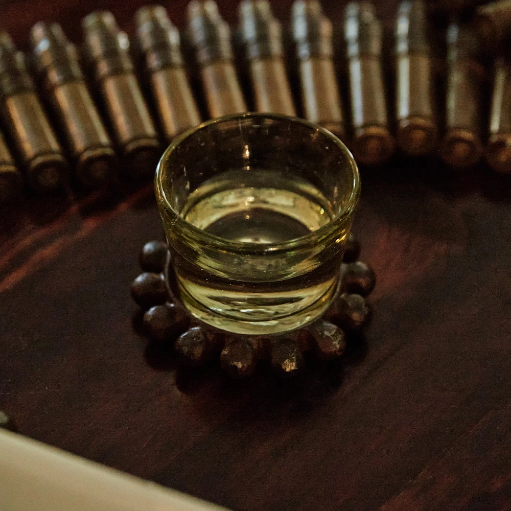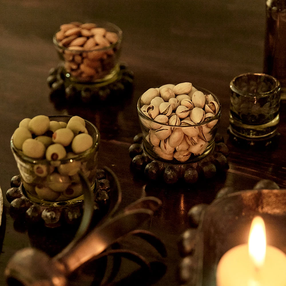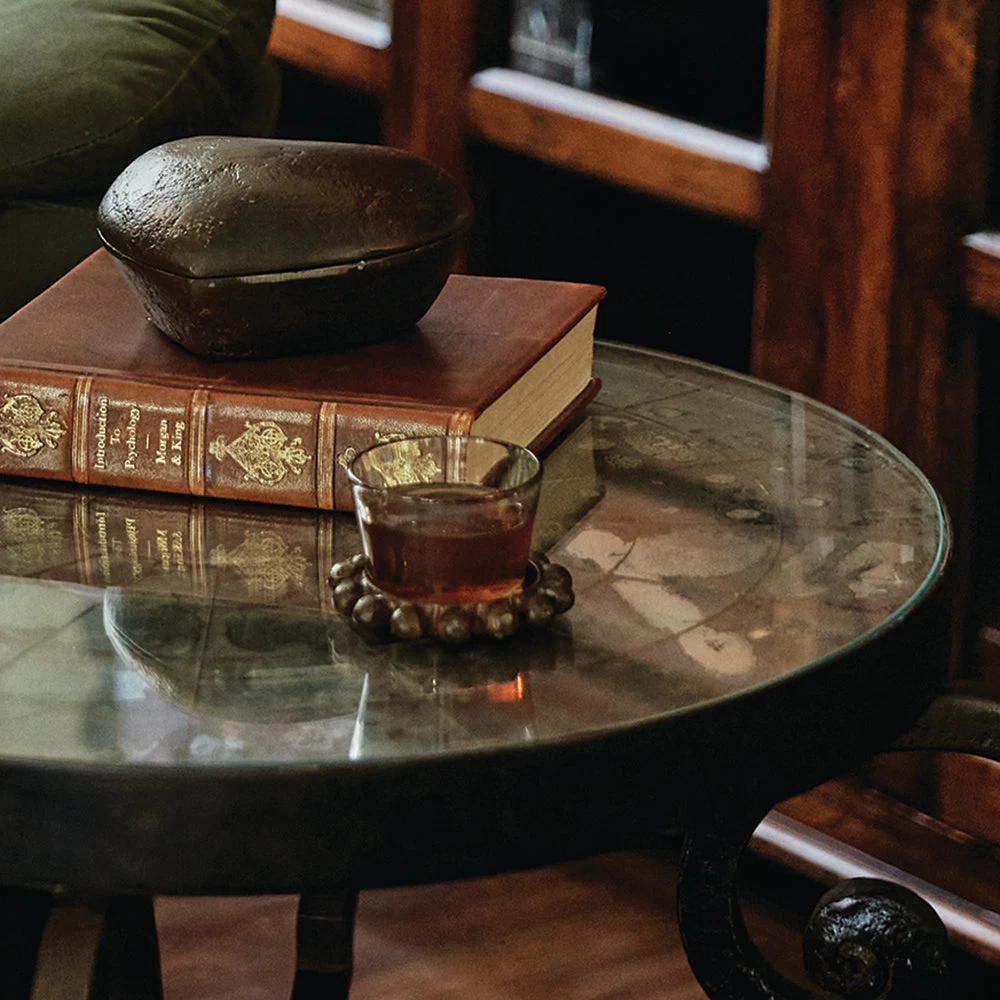 - Mouth blown glass votive in a wax cast iron ballin coaster