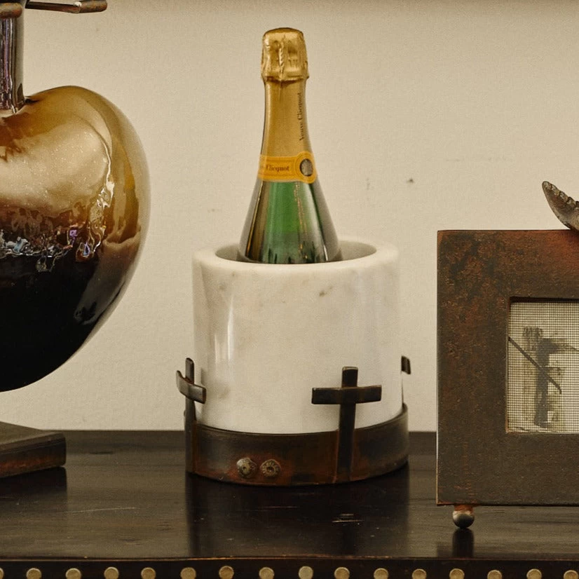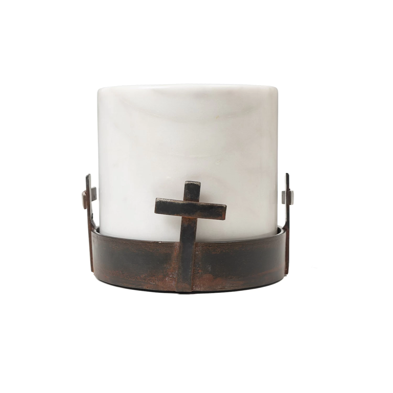 - Natural marble vessel nests in an iron base encircled with primitive iron crosses.