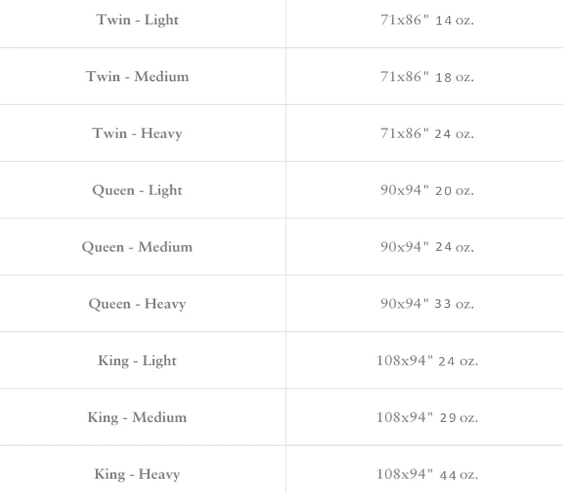 Weight: Light Summer Weight, Medium Year Round All Seasons, Heavy Winter Weight