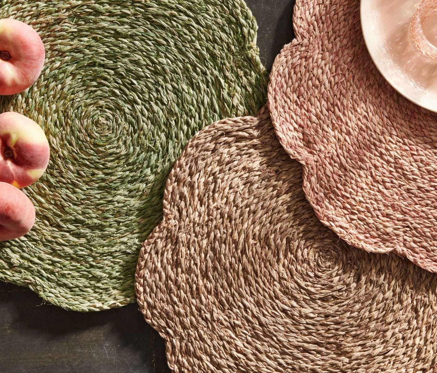 - Scallop floral woven raffia flower placemat in pale green hue