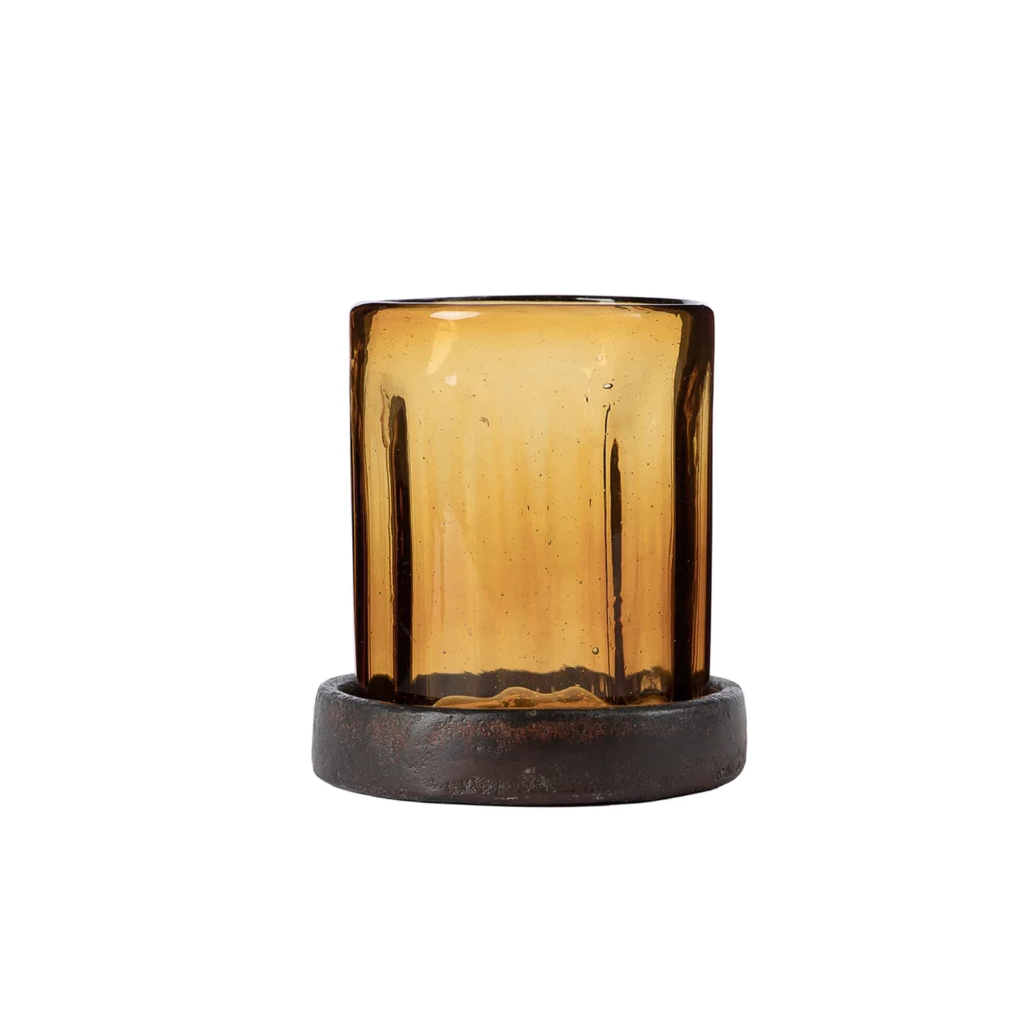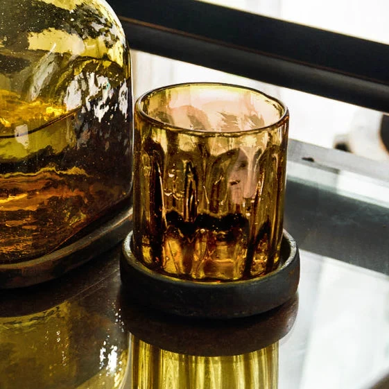 - Mouth-blown acanalada double old fashioned in the color of toasted tobacco resting in a detachable wax cast iron coaster