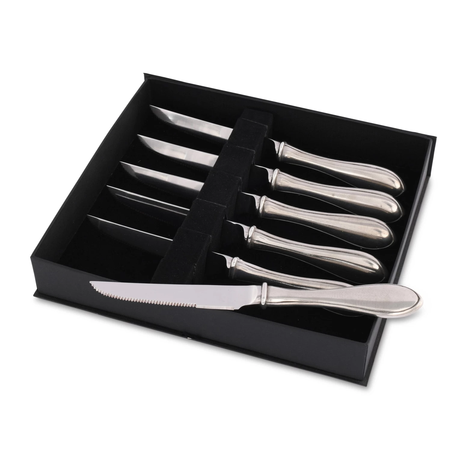- Functional and elegant. Striking and simple. Luxury grade pewter handled knives with a banded grip and a curved pointed end. Stainless steel blades.