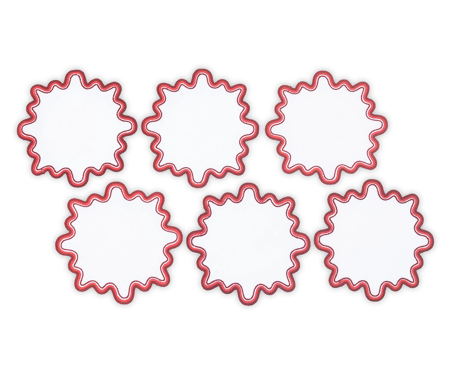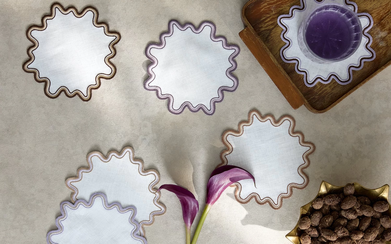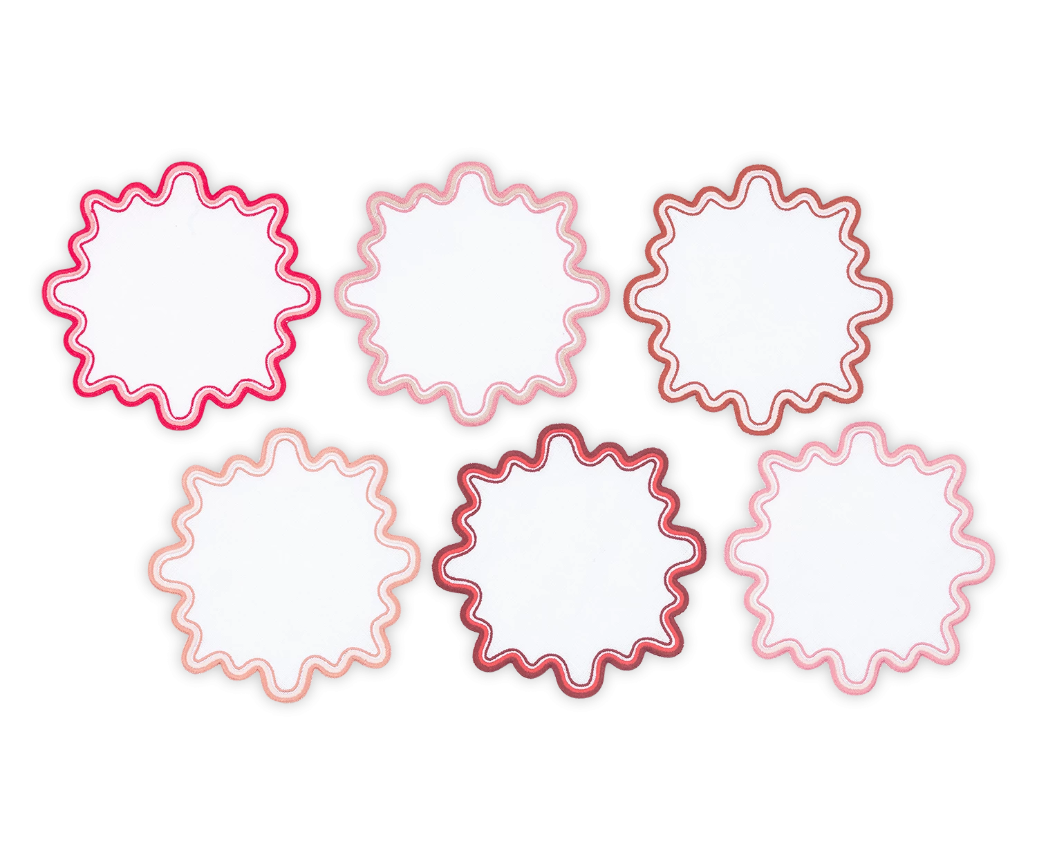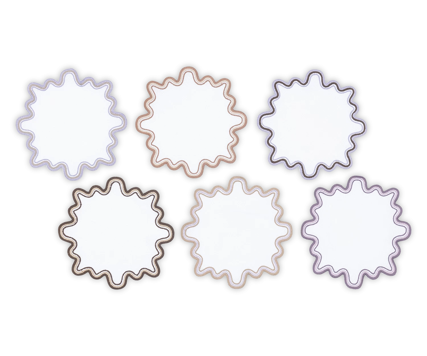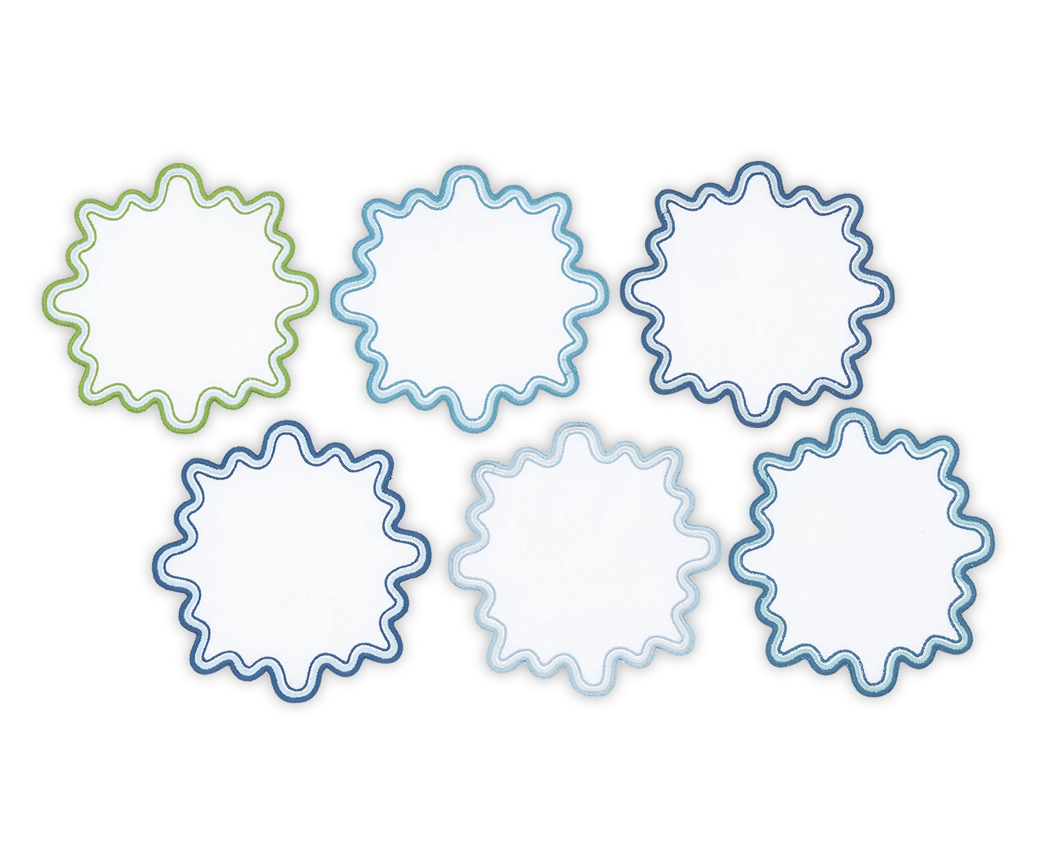- Playful white linen cocktail napkin set with wave like edge embroidery in a set of complementing colors